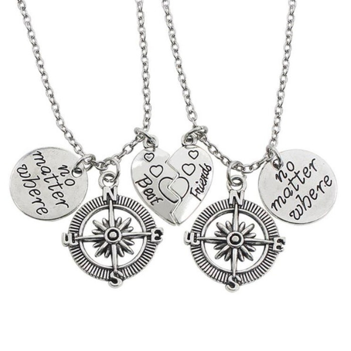 Best friends - no matter where (Legjobb barátok - nem számít, hol) érdekes kialakítású páros nyaklánc, tehát 2 darab. A két medált összerakva kapjuk meg a teljes képet, de önmagukban is hordozzák az üzenetet. Szív és karika motívumokkal. A fém felülete enyhén rusztikus. Hordjátok ezt a nyakláncot mindketten, hogy sose feledjétek, valami örökre összeköt titeket...