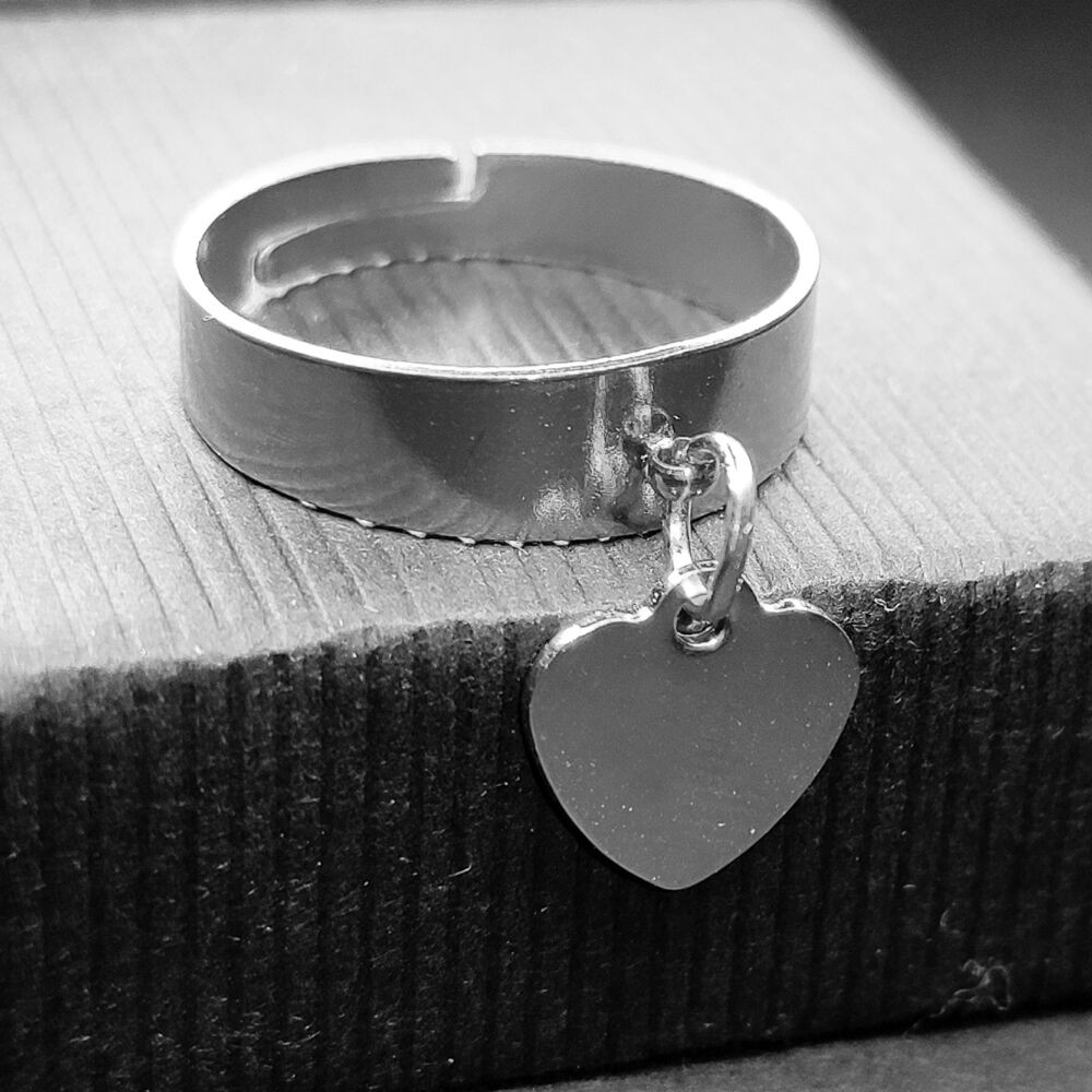 Szív charmos állítható méretű rozsdamentes acél gyűrű, ezüst színű, választható szélességben.